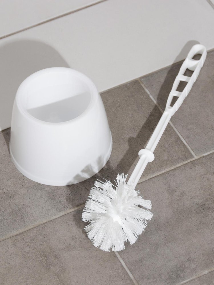 Универсальный белый ерш для унитаза с подставкой — компактный, легкий, влагоустойчивый, легко очищается и поддерживает чистоту санузла.