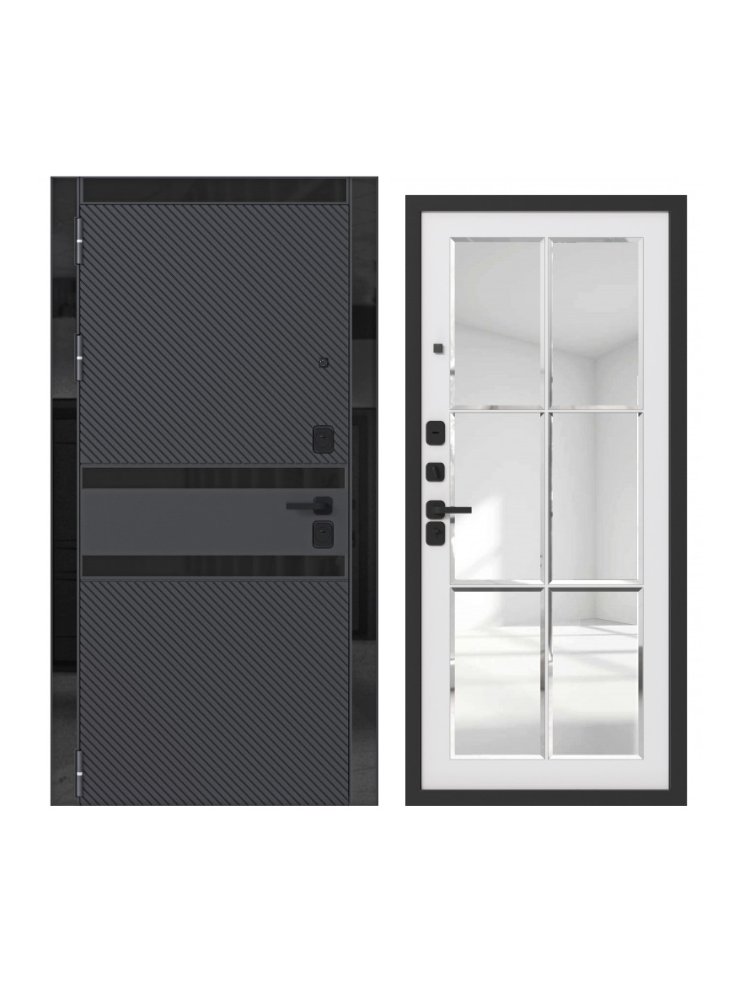 Наличник: МДФ 98 мм., вставки стекло чёрное.Петли: 3 шт., наружные, открывание 180°.Размеры: 960х2050, 860х2050.Ориентация: Правая и левая.Производитель: Россия.Толщина полотна: 90 мм.Глубина коробки: 115 мм.Внешнее покрытие: Порошково-полимерное покрытие Чёрный муар с блёстками. МДФ-панель 16 мм., вставки стекло чёрное с еврокромкой. Цвет: Софт чёрный.Внутреннее покрытие: МДФ-панель 12 мм., зеркало с фацетом. Цвет: Софт белый.Толщина металла: 1,2 мм.Наполнение: Базальтовая плита.Уплотнитель: 3 контура уплотнения.Основной замок: Guardian цилиндровый (ключ-вертушка).Дополнительный замок: Guardian цилиндровый (ключ-ключ).Броненакладка: Есть.Ночная задвижка: Есть.Фурнитура чёрная: Fuaro. Прочная металлическая дверь с утеплителем, звукоизоляцией и повышенной защитой идеально подходит для квартир, офисов и частных домов.