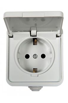 Влагозащищённая розетка с крышкой IP44, накладной монтаж, безопасна для помещений с влажностью и улицы, выдерживает до 16А, быстро устанавливается.
