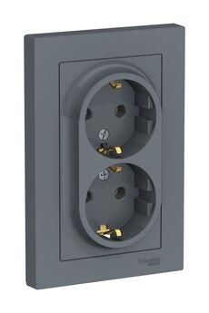 Двойная розетка 16А с заземлением, моноблок, надежна, легка в установке. Безопасность, стильный грифельный цвет, подходит для любых помещений.