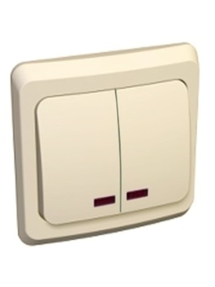 Двухклавишный выключатель с подсветкой, нагрузка до 10А, накладной монтаж, эргономичный и долговечный, цвет кремовый, для удобного управления светом.