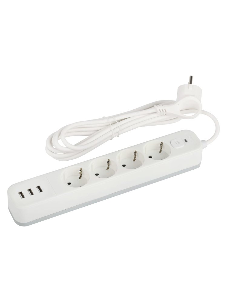 4 розетки с заземлением, 3 USB-порта, 1,5 м кабель, защита от перегрузки — для подключения и зарядки техники дома, в офисе или на стройке.