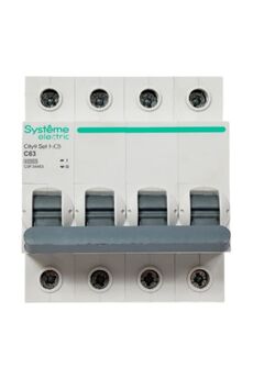 3-полюсный выключатель на 63А, характеристика C, рабочее напряжение 400В, отключающая способность 4,5кА, надёжная защита цепей от перегрузок.