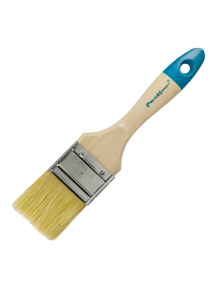 Натуральная светлая щетина. Предназначена для всех типов лакокрасочных материалов. Кончики щетины на конце расщеплены для лучшей впитываемости краски. Бандаж изготовлен из жести. Для надежного удержания щетины используется клей на эпоксидной основе и деревянные клинья. Рукоятка деревянная покрыта лаком. Кончик кисти окрашен цветной краской. Плоская кисть 50 мм с натуральной щетиной для ровного нанесения красок и лаков, прочная, удобная, подходит для любых типов поверхностей.