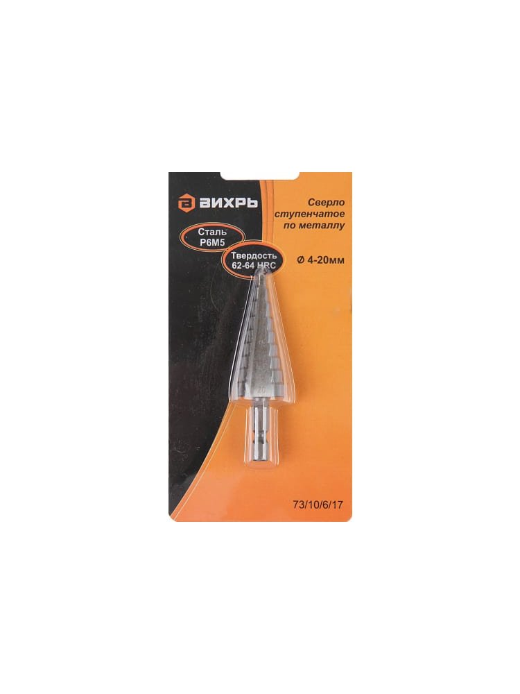 Сверло ступенчатое Вихрь служит для сверления отверстий разных диаметров 4-6-8-10-12-14-16-18-20 мм. Подходит для работ по стали, цветным металлам, нержавейке и изделиям из пластика.  Сверло выполнено из качественной стали Р6М5, твердость 62 – 64 HRC. Выполняет сверление без засверловки, исключает появление заусенцев на поверхности обрабатываемого материала. Хвостовик имеет 6 граней, благодаря чему надежно фиксируется в патроне. Хвостовик универсален в применение, подойдет к большинству типов дрелей, шуруповертов. Внимание, изображение товара может отличаться от реального! Верные параметры указаны в технических характеристиках товара. Ступенчатое сверло 4–20 мм, шаг 2 мм, быстрое и аккуратное сверление металла и пластика, износостойкость и универсальность применения.