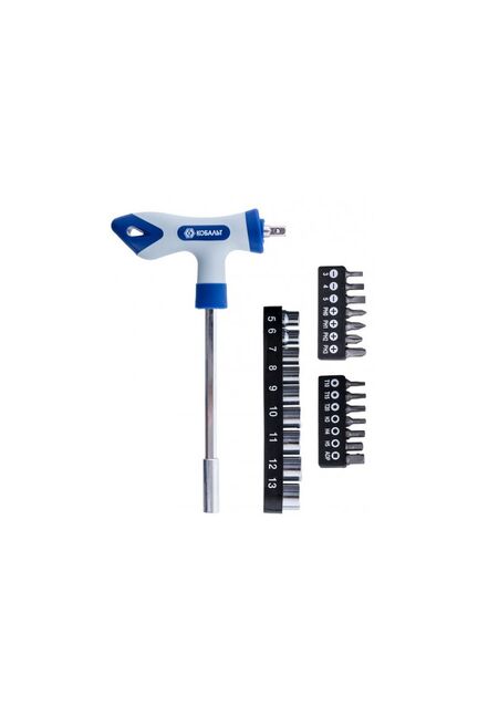 - 24 предмета: насадки-биты (шлицевые, крестовые, шестигранные, Torx), торцевые головки 1/4" и переходник