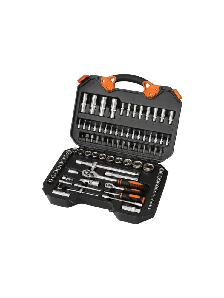 - 94 предмета: воротки, трещотки, удлинители, кардан, головки 1/2" и 1/4", битовые насадки, свечные ключи и аксессуары.