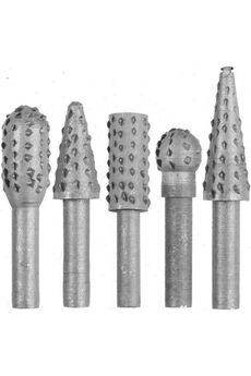 Шарошки по дереву. Серии "Мастер" и "Сделай сам" Насадки рашпильные (шарошки) изготовлены из высокоуглеродистой инструментальной стали, предназначены для обработки дерева, фанеры, ДСП, пластика с помощью высокооборотной дрели. Основное применение - обработка плоских и криволинейных поверхностей, расширения отверстий, снятия фасок и заусенцев. Крупная насечка для высокой производительности работ. Набор стальных шарошек 5 штук для точной обработки дерева: подходит для шлифовки, зачистки и фигурной доработки под дрель или гравер.