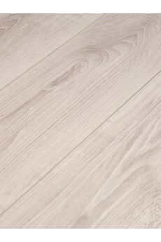Износостойкий ламинат с фаской V4, декор под белый дуб, монтаж без клея, класс 32, подходит для "теплого пола" и интенсивного использования.