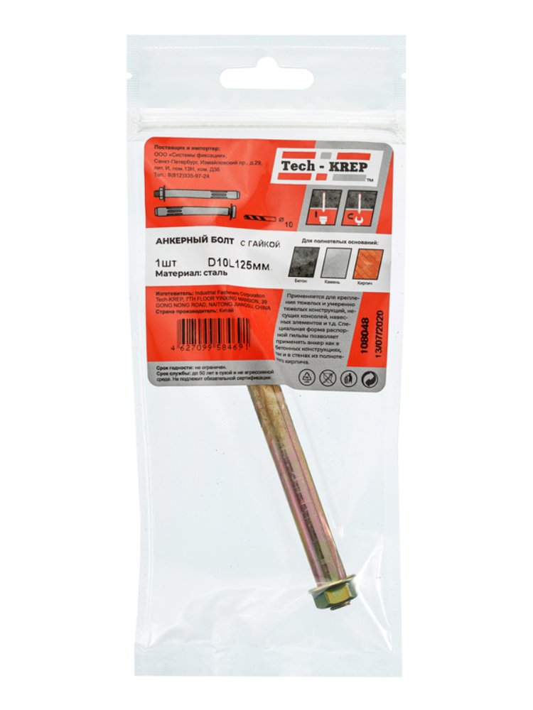 Анкерный болт с гайкой 10х125 мм от Tech-Krep представляет собой надежный крепежный элемент, предназначенный для создания прочных соединений в строительных конструкциях. Изготовлен из высококачественной стали с антикоррозийным покрытием, что обеспечивает долговечность и устойчивость к воздействию влаги. Диаметр болта составляет 10 мм, длина — 125 мм, что делает его подходящим для работы с различными материалами. Конструкция с гайкой позволяет быстро и удобно выполнять монтаж, обеспечивая надежную фиксацию. Комплект поставляется в индивидуальной упаковке (1 шт), что упрощает хранение и использование.