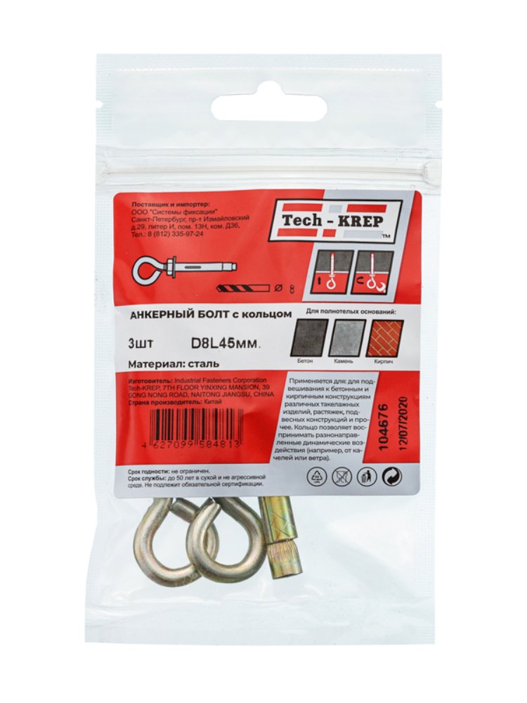 Анкерный болт с кольцом 8х45 мм от Tech-Krep представляет собой надежный крепежный элемент, предназначенный для создания прочных соединений в строительных конструкциях. Изготовлен из высококачественной стали с антикоррозийным покрытием, что обеспечивает долговечность и устойчивость к внешним воздействиям. Комплект включает 3 болта, что делает его удобным для небольших монтажных работ. Конструкция с кольцом позволяет использовать болт для подвеса грузов или крепления тросов, цепей и других элементов. Диаметр 8 мм и длина 45 мм подходят для работы с различными материалами, включая бетон, кирпич и камень.