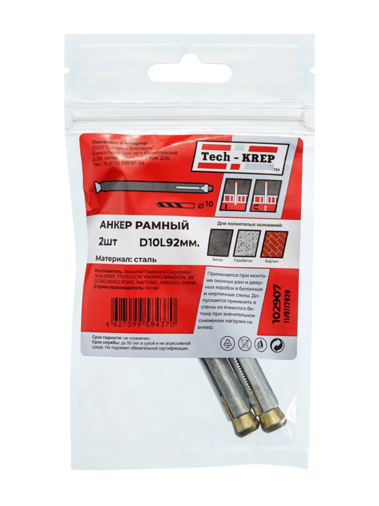 Металлический рамный дюбель 10х92 мм от Tech-Krep предназначен для надежного крепления тяжелых конструкций к полнотелым основаниям, таким как бетон, кирпич или природный камень. Изготовлен из прочной стали с антикоррозийным покрытием, что гарантирует долговечность и устойчивость к воздействию окружающей среды. Комплект из 2 штук поставляется в удобном пакете, что упрощает хранение и транспортировку. Дюбель обеспечивает высокую прочность соединения благодаря своей конструкции с распорным механизмом, что делает его идеальным для монтажа рам, профилей и других строительных элементов.