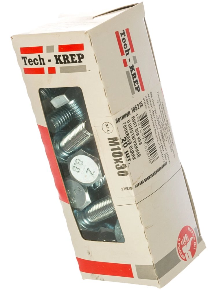 Болт DIN933 М10х30 с шестигранной головкой, оцинкованный, 20 шт. в коробке с окном Tech-Krep. Высокая прочность, защита от коррозии, для строительства и ремонта.
