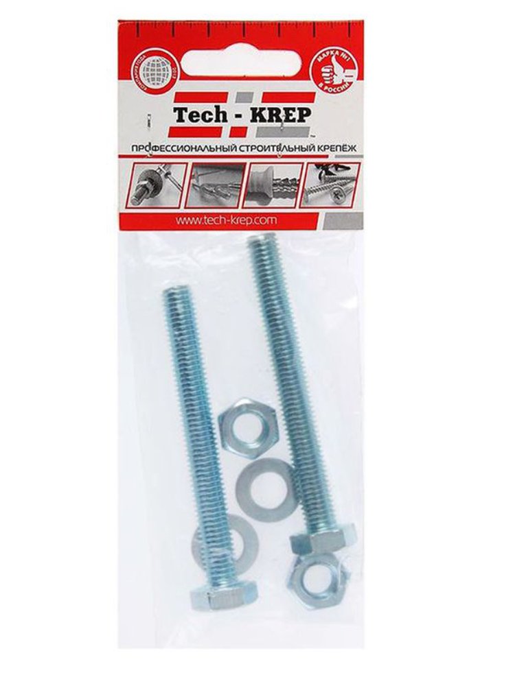 Болт DIN 933 М10х70 с шестигранной головкой, оцинкованный, в комплекте с гайкой и 2 шайбами, Tech-Krep. Надежный крепеж для строительства и ремонта.
