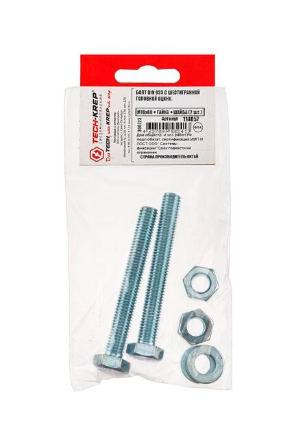 Комплект крепежных элементов включает болт с шестигранной головкой DIN 933, оцинкованный, размером М10х80, а также соответствующую гайку и две шайбы. Изделия изготовлены из высококачественной стали с цинковым покрытием, что обеспечивает защиту от коррозии и долговечность в условиях повышенной влажности. Болт имеет полную резьбу, что гарантирует надежное соединение деталей. Комплект упакован в практичный пакет от производителя Tech-Krep, что упрощает хранение и транспортировку. Подходит для выполнения монтажных и строительных работ, обеспечивая прочное крепление конструкций.