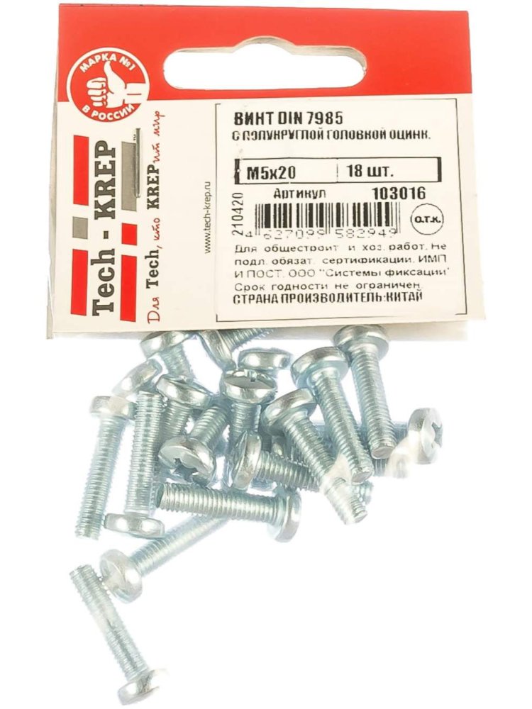 Винт с полукруглой головкой DIN 7985, размером М5х20, в упаковке 18 штук от Tech-Krep, изготовлен из высококачественной стали с оцинкованным покрытием, что обеспечивает надежность и долговечность крепления. Используется для соединения различных элементов конструкций, подходит для работы с шуруповертом или отверткой благодаря крестообразному шлицу. Полукруглая головка обеспечивает аккуратный внешний вид соединения и снижает риск повреждения поверхности.