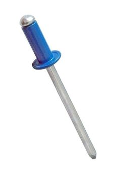 Заклепки алюминий-сталь используются: для неразъёмного соединения листового металла, крепления различных деталей к металлическим конструкциям методом сквозного монтажа. Состоит из распорной втулки и стержня с увеличенным шарообразным концом. Комбинированная заклёпка 4,8×10 мм ярко-синяя, алюминий/сталь, стойкая к коррозии, для прочного и декоративного соединения. 500 шт.