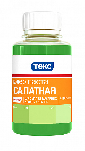Колеровочная паста универсальная для эмалей, масляных и водно-дисперсионных красок. Для колеровки фасадных красок рекомендуется использовать только колер пасты: Кофейная №10, Бежевая №15, Карамель №22, Охра №09 . Не рекомендуется использовать для колеровки известковых и силикатных красок. Колер паста не используется в чистом виде. Универсальный салатный колер 0,1 л для водных и акриловых красок. Яркий цвет, легкое смешивание, экономичный расход и высокая стойкость оттенка.