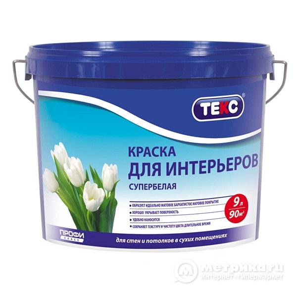 Для окраски стен и потолков внутри сухих помещений по бетонным, оштукатуренным, гипсокартонным, кирпичным и деревянным поверхностям. Глубокоматовая. Время высыхания 1 час. Следующий слой можно наносить через 1,5 часа. Расход 9-11 м²/л по ровной невпитывающей поверхности; 7-9 м²/л по неровной впитывающей поверхности. Разбавитель - вода. Матовое покрытие, высокая укрывистость, белоснежный цвет, без запаха, легко наносится и быстро высыхает, подходит для любых интерьеров.
