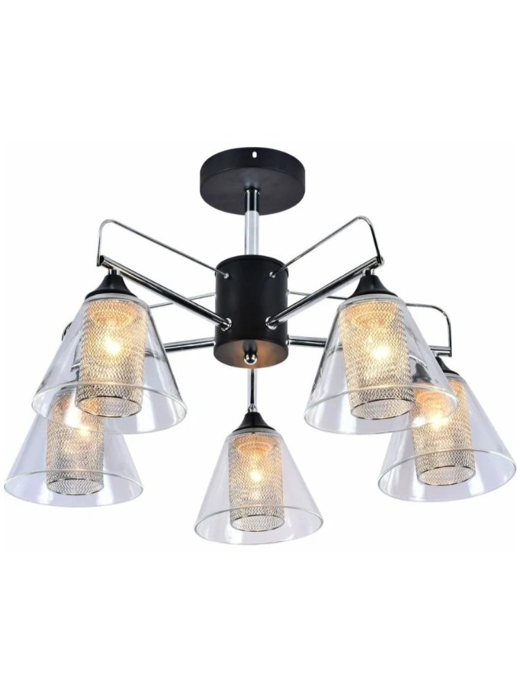 Размеры: (Д*Ш*В) 575*575*350 мм Потолочная люстра на 5 ламп E27 мощностью до 60 Вт, цвет черный/хром, для освещения комнат до 20 м². Современный дизайн, легкий монтаж.