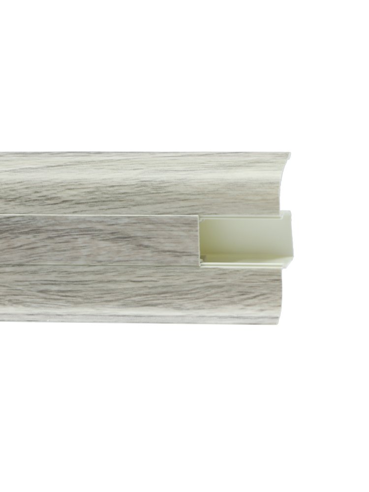 Утонченный и высокий профиль (58 мм) с острыми краями. Благодаря съёмной панели монтаж электрических проводов, покраска стен, оклеивание обоями возможны без демонтажа профилей. Конструкция позволяет монтировать и демонтировать плинтус без использования инструментов. Существует возможность размещения большого количества проводов, в том числе после монтажа. Специальная двухслойная технология: помимо слоя краски, дополнительно покрывается специальным лаком, благодаря чему его покрытие становится однородным, а это дополнительно защищает изделие от разного вида механических повреждений и вредного воздействия лучей УФ. Благодаря эластичному материалу, плинтус идеально прилегает даже к неровностям стен и полов. ПВХ-плинтус 58 мм, "Дуб Альба", 2,5 м, влагостойкий, легко монтируется, скрывает кабель, подходит для жилья, офиса и коммерческих помещений.