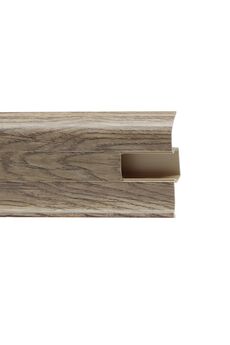 Утонченный и высокий профиль (58 мм) с острыми краями. Благодаря съёмной панели монтаж электрических проводов, покраска стен, оклеивание обоями возможны без демонтажа профилей. Конструкция позволяет монтировать и демонтировать плинтус без использования инструментов. Существует возможность размещения большого количества проводов, в том числе после монтажа. Специальная двухслойная технология: помимо слоя краски, дополнительно покрывается специальным лаком, благодаря чему его покрытие становится однородным, а это дополнительно защищает изделие от разного вида механических повреждений и вредного воздействия лучей УФ. Благодаря эластичному материалу, плинтус идеально прилегает даже к неровностям стен и полов. Практичный плинтус 2,5 м с кабель-каналом, высотой 58 мм, цвет дуб новарский. Легкий монтаж и долговечный материал для стильного интерьера.