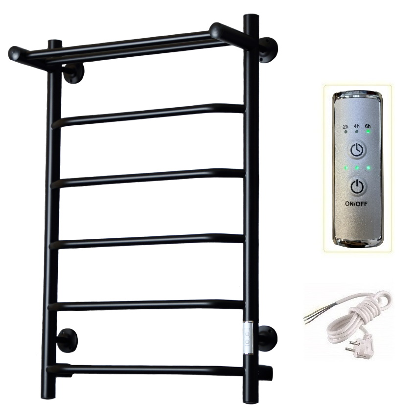 Изделие производится из углеродистой стали. Вертикальные трубы d-32 мм, для горизонтальных вставок используется труба d-18 мм. Нагревательным элементом в полотенцесушителе является греющий кабель — аналог «теплого пола», кабель заправляется внутрь каждой трубы и передает тепло на поверхность изделия. Во включенном состоянии постоянно поддерживается температура 50-60 градусов. Полотенцесушитель снабжен панелью управления. Кнопка включения/выключения и таймер на 2/4/6 часов , который позволяет включать изделие на ограниченное время. Эта функция дает возможность экономить электричество. Стильный черный полотенцесушитель 80×50 см, 6 перекладин, легко монтируется, быстро сушит бельё и предотвращает сырость в ванной.
