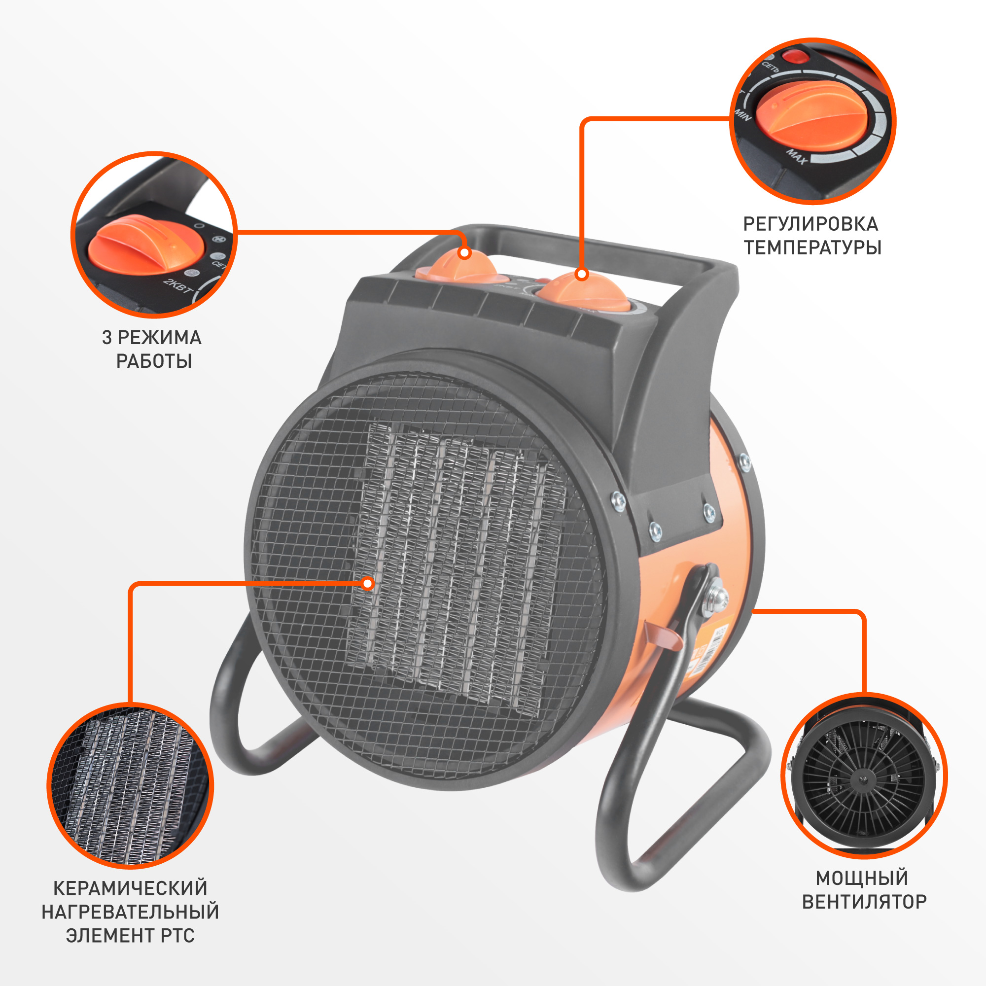 Компактный, мобильный, надежный нагревательный электроприбор. Служит для обогрева воздуха в различных помещениях. В жаркое время года возможно использование прибора в качестве вентилятора, без включения нагревательных элементов. В обогревателе используется высококачественный керамический полупроводниковый нагревательный элемент PTC, при работе которого уровень мощности автоматически корректируется в зависимости от изменений температуры окружающей среды. За счет уникальных свойств нагревательного элемента, увеличивается срок службы прибора. В обогревателе установлено мощное воздуходувное устройство, благодаря которому приятный горячий воздух подается с большой скоростью, что позволяет быстро и эффективно прогреть помещение. Компактная тепловая пушка 2 кВт с керамическим элементом, защитой от перегрева и равномерным обогревом для гаража, склада и ремонта.