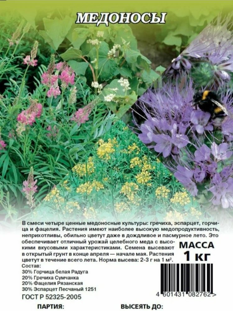 - В составе: фацелия, горчица, люпин, донник и другие медоносные растения