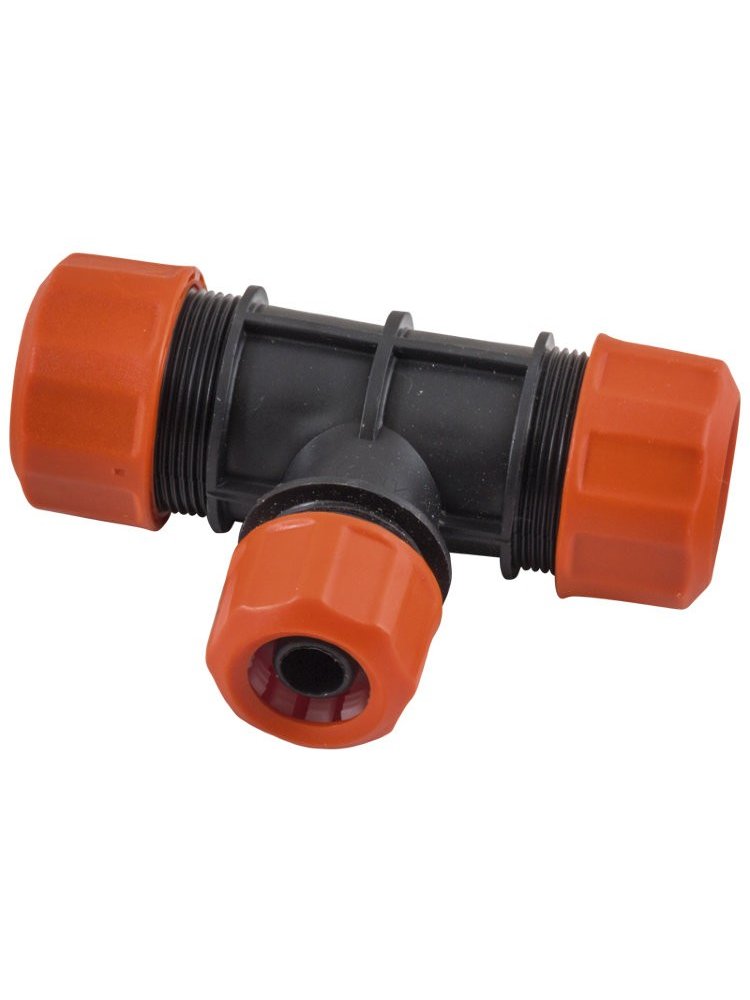 Цанговый тройник для герметичного соединения трех 1/2" труб, прочный корпус и простая установка без инструментов, подходит для воды и полива.