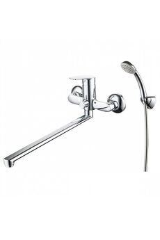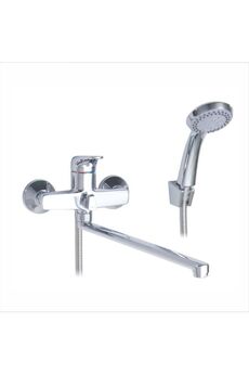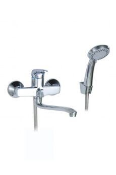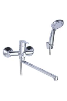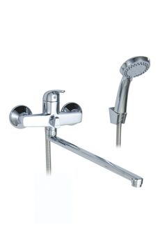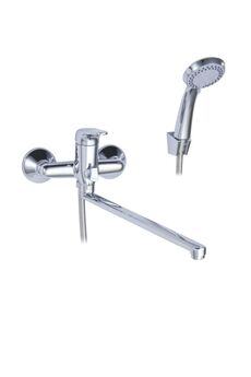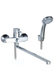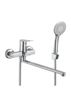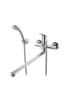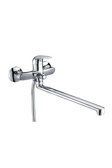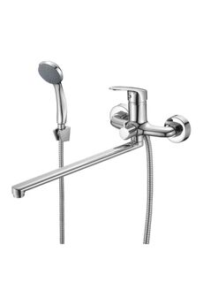 Однорычажный смеситель, латунь с хромом, керамический картридж, длина излива 38,5 см, настенный монтаж, для ванны и душа.