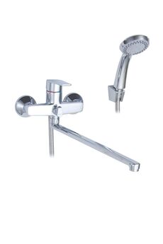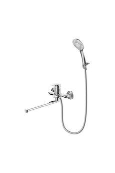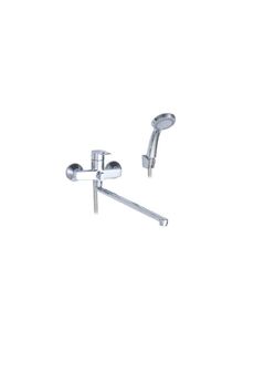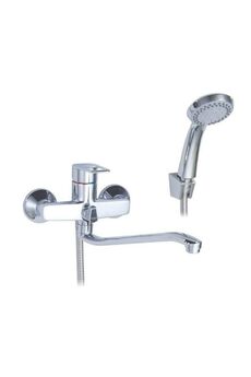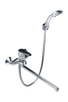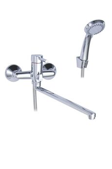Однорычажный смеситель с длинным изливом 35 см, керамическим картриджем, хромовым покрытием, в комплекте душевой гарнитур, плавная регулировка.