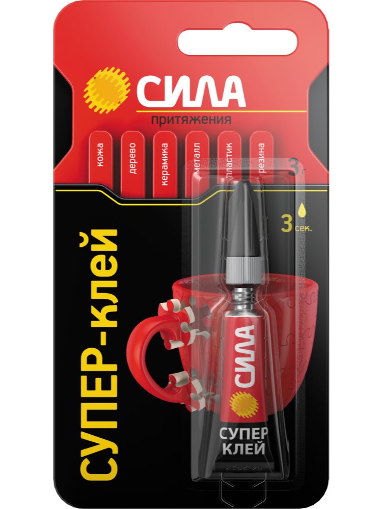 Супер-клей СИЛА, идеально подходит для быстрого и эффективного ремонта различных предметов мебели, интерьера и т.д. Накрепко схватывает дерево, резину, стекло, фарфор и пластик, при этом супер клеи экономично расходуются и высыхают за несколько секунд. * 100% цианоакрилат - высокая концентрация клеящих ингредиентов, обеспечивает крепкое, мгновенное соединение частей различных предметов. * Удобный само вскрывающийся тюбик - при накручивания колпачка, обеспечивает быстрое и аккуратное использование. * Предусмотрена перфорация "ёлочка" под тюбиком для извлечения его быстро и без усилий. Моментальное склеивание