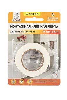 Монтажная лента 19х1,5 м держит до 2 кг, быстро фиксирует детали без сверления, легко снимается, подходит для большинства гладких поверхностей.