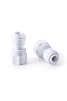 Фитинг с внутренней резьбой для соединения фильтра и крана для питьевой воды. Дает возможность соединить отрезки пластиковых коннекторов и трубок разных диаметров и надежно зафиксировать их. Деталь изготовлена из пищевого пластика. Быстросъемный фитинг для соединения фильтра и крана, прочный пластик, 7/16"-1/4QF, прост в установке, не допускает протечек.