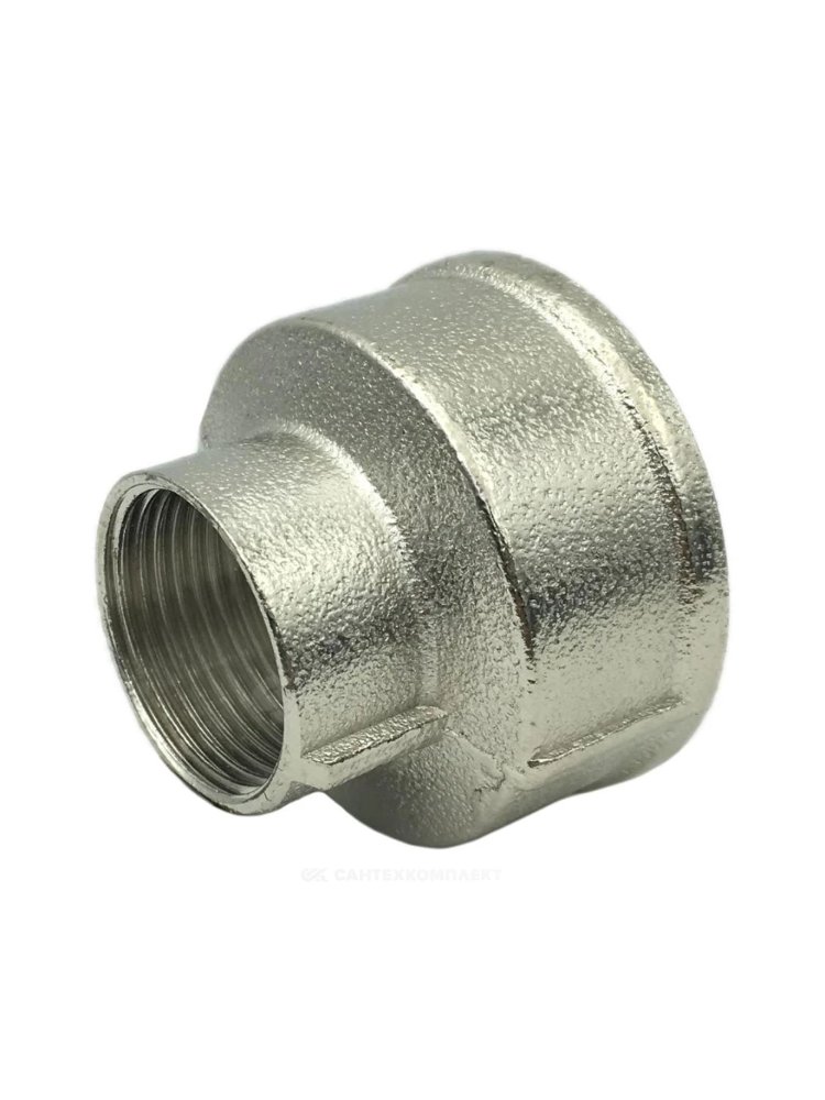 Латунно-никелированная муфта 25х15 мм надежно соединяет трубы разного диаметра, устойчива к коррозии, подходит для систем отопления и водоснабжения.