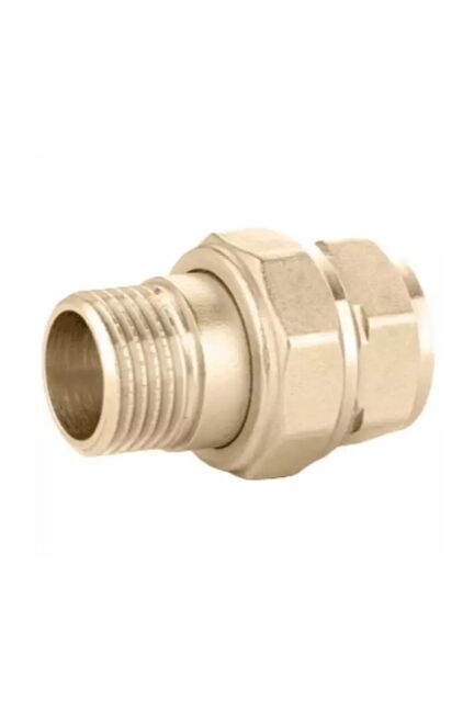 Герметичное соединение труб Ду 25, латунь с никелем, ВР–НР, выдерживает до 10 бар, устойчива к коррозии, подходит для водоснабжения и отопления.